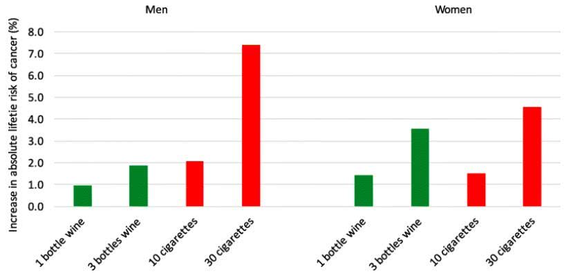 數(shù)據(jù)顯示,在不吸煙者中,每周喝一瓶葡萄酒與男性終生癌癥風(fēng)險(xiǎn)額外增加1%有關(guān),與女性終生癌癥風(fēng)險(xiǎn)額外增加1.4%有關(guān)。研究人員解釋,女性風(fēng)險(xiǎn)更高的主要原因是酒精和乳腺癌風(fēng)險(xiǎn)相關(guān),而在男性中,酒精主要與
