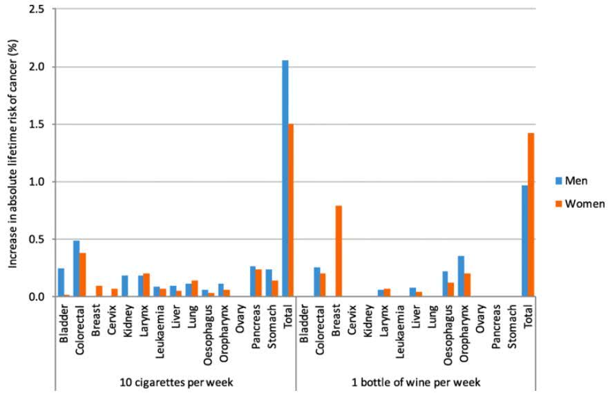 ▲每周吸十支煙(非飲酒者)或喝一瓶紅酒(非吸煙者)帶來的癌癥絕對(duì)終生風(fēng)險(xiǎn)(圖片來源:參考資料[1])