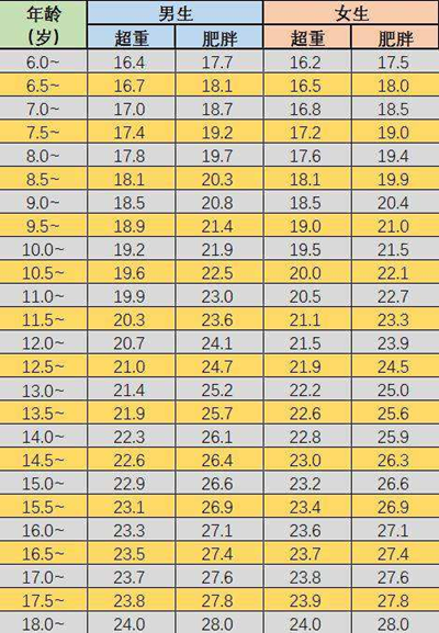 判斷孩子是否超重肥胖,不能只盯著體重的數(shù)字看,說超過多少斤就算胖,還需要結合身高,最常用的指標是體質指數(shù)BMI(kg/㎡),即用體重(kg)除以身高(m)的平方,不同年齡段兒童超重與肥胖的范圍,可以參考下表: