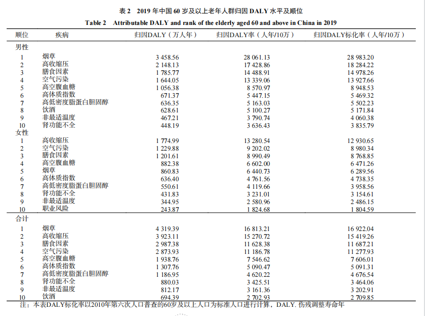 另外,與2009年相比,2019年影響中國(guó)60歲及以上老年人群健康的危險(xiǎn)因素順序也發(fā)生了變化。其中,膳食因素、高體質(zhì)指數(shù)、腎功能不全和飲酒的順位有所提高,而空氣污染、高低密度脂蛋白膽固醇和非最適溫度的順位出現(xiàn)下降。