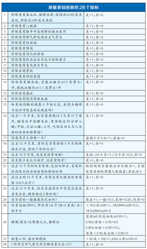 那么,如何計算自己的衰弱程度呢?研究規(guī)定,衰弱指數(shù)等于個體符合的疾病或缺陷數(shù),除以納入的疾病或缺陷總數(shù)(即28個)。也就是說,如果一個人滿足或達到上述指標(biāo)中的至少7項,身體狀況就可能到了衰弱期。