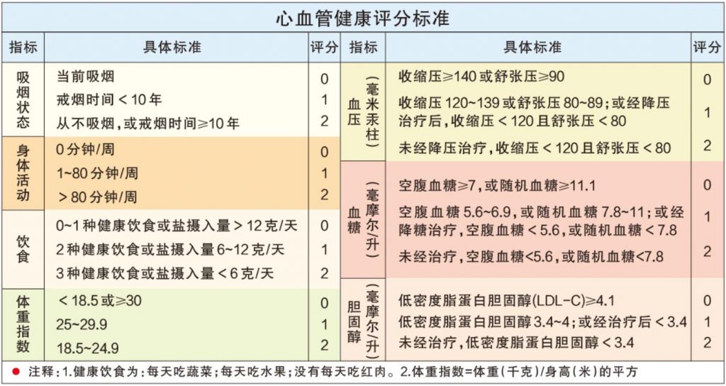 在《中華醫(yī)學雜志(英文版)》上,華中科技大學同濟醫(yī)學院等機構(gòu)的研究人員曾針對理想心血管健康與中國成年人死亡風險降低的關聯(lián)進行研究,根據(jù)近20萬人的健康數(shù)據(jù)分析得出,不論個人當前的醫(yī)學因素和生活行為是怎樣的,只要盡早以健康的生活行為和良好的心臟代謝狀況為目標采取措施,就可以減少過早死亡。他們還提出了適合評估國人心血管健康的評分標準(如圖),總分為0~6分,代表心血管健康水平不良,7~9分為中等水平,10~14分為理想水平。
